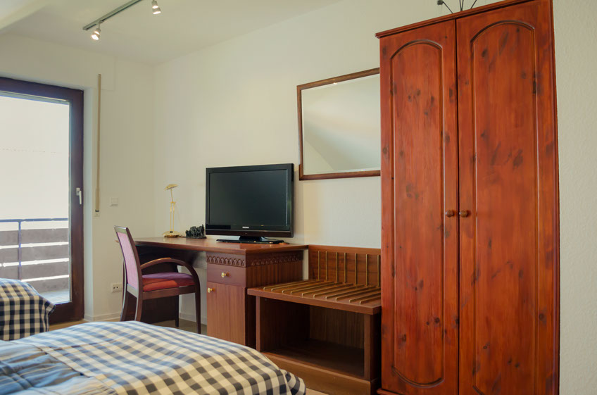 Schlafzimmer mit TV, Schrank u. Kofferablage
